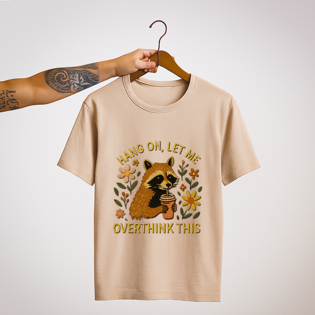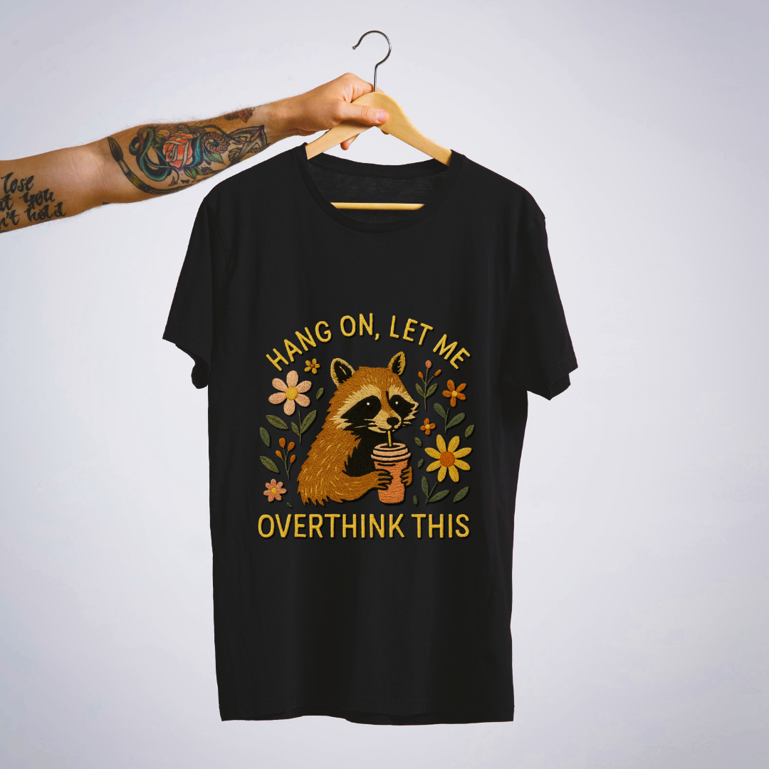 For the chronic overthinkers — we see you 🦝💭. This tee blends humor with comfort, featuring a cute raccoon sipping from a cup, surrounded by florals 🌼. A perfect mix of sarcasm and sweetness, it’s your go-to shirt for when your brain just won’t stop running laps.