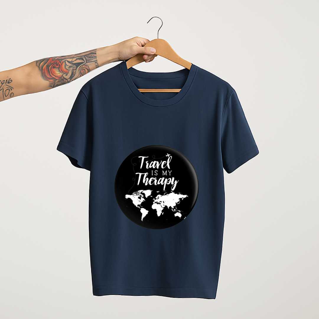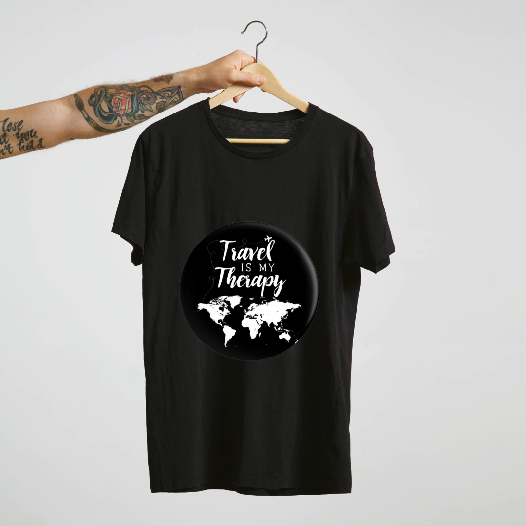 A bold world map design paired with the statement “Travel is My Therapy” makes this a powerful shirt for wanderers, adventurers, and anyone who believes traveling cures the heart.